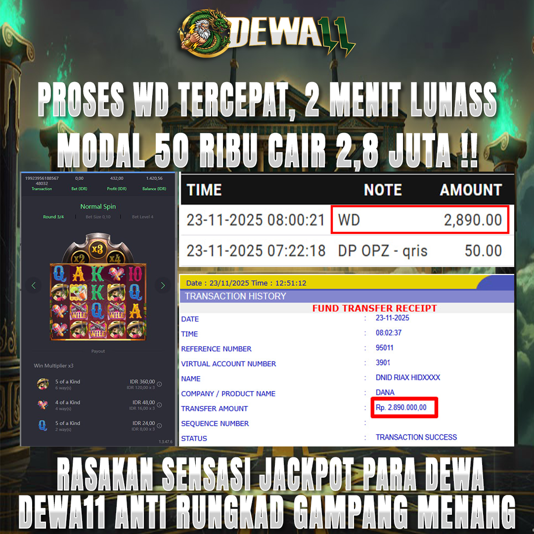 DEWA11 menghadirkan game jackpot vip yang di lengkapi fitur khusus new member hanya dengan modal deposit 50k dijamin akan withdraw 2,8+ juta malam ini.